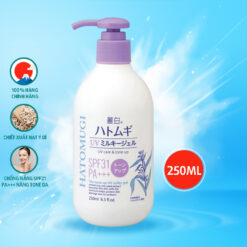 Sữa Dưỡng Thể Dưỡng Ẩm Nâng Tông Hatomugi UV Care & Tone Up SPF31 PA+++ The UV Milky Gel thiết kế dạng chai có nắp pump. Phần bao bì của dòng sữa dưỡng thể này được thiết kế tương đối đơn giản với màu trắng làm chủ đạo. Phần thân có đầy đủ thông tin. Với dung tích 250ml, các chị em có thể tiết kiệm được ngân sách và dễ dàng sử dụng trong thời gian dài.