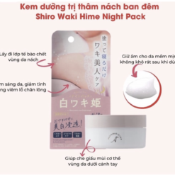 - Kem dưỡng trị thâm nách ban đêm Shiro Waki Hime Night Pack với nhiều tác dụng nổi bật như làm sáng dần màu da, chứa thành phần chống viêm nang lông giúp da giảm sần đồng thời với chiết xuất placenta (nhau thai cừu) giúp ngăn ngừa vùng da dưới cánh tay bị sạm màu trở lại ,sạch sâu tận lỗ chân lông cho bạn một làn da khỏe mạnh.