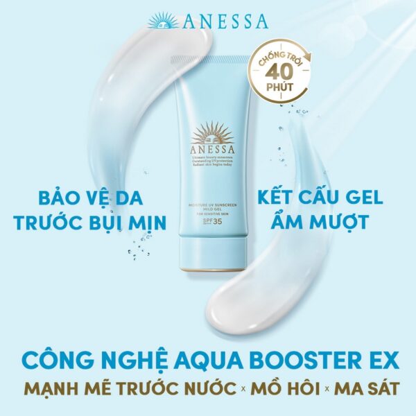 Gel Chống Nắng Anessa Moisture UV Sunscreen Mild Dịu Nhẹ Cho Da Nhạy Cảm & Trẻ Em SPF35 PA+++ 90g là sản phẩm giúp bảo vệ làn da bạn , đặc biệt là da nhạy cảm và trẻ con dưới ánh nắng mặt trời mà không làm khô rát làn da. Sản phẩm với chiết xuất thiên nhiên còn giúp dưỡng ẩm cho da, giúp da luôn căng mịn và đàn hồi.