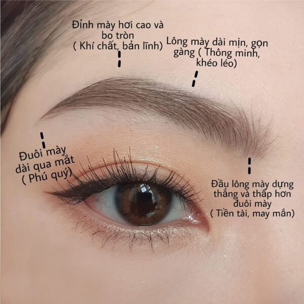 Mô tả: Lông mày mịn, mọc xuôi cong đều như hình trăng non, rõ như nét vẽ, sắc đen như mực tàu, đuôi mày dài qua mắt, trông hình thể lông mày thanh tao.