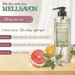 Sữa tắm nước hoa dưỡng da mềm mịn Mellsavon đem đến 3 tầng hương quyến rũ với note đầu là chanh, bạch đàn, cam ngọt, cam ruột đỏ; nốt giữa là hương hoa cam, hoa bưởi, hoa hạnh nhân và nốt cuối là Vanilla và xạ hương. Note hương chủ đạo của sữa tắm nước hoa dưỡng ẩm mềm mịn Mellsavon là hương hoa cam ngọt ngào được pha chế bởi Karine Vinchon Spehner, nhà sáng chế nước hoa nổi tiếng thế giới, đem đến hương thơm nhẹ nhàng, thư thái mang đến cảm giác như đang dạo bước ở kinh đô Grasse nước Pháp.