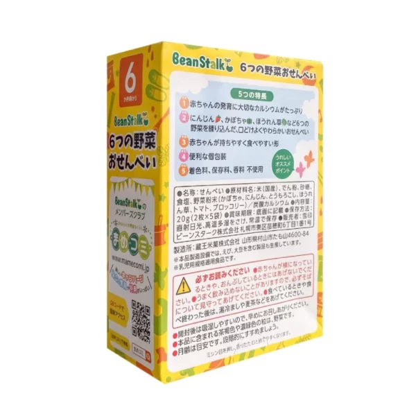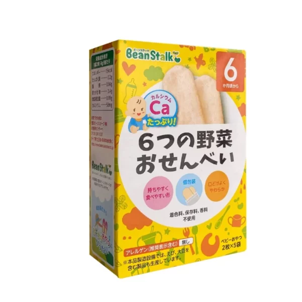 - Bánh gạo bổ sung canxi và 6 loại rau củ Beanstalk với nguồn nguyên liệu nội địa được lựa chọn kỹ càng, chế biến theo quy chuẩn Nhật Bản và bằng tất cả sự tận tâm, mang đến những bữa ăn ngon miệng và đảm bảo chất lượng cho bé để bố mẹ có thể hoàn toàn yên tâm khi cho bé sử dụng sản phẩm.