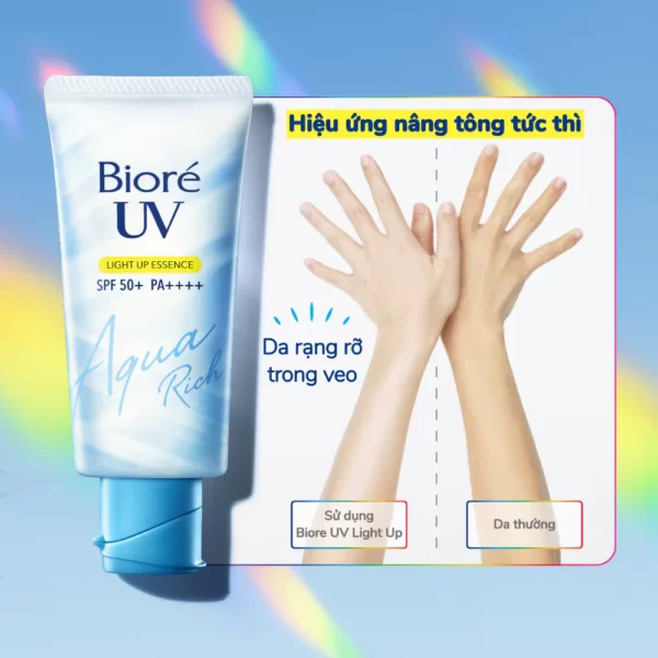 Bioré UV Aqua Rich Light Up Essence SPF50+/++++ là tinh chất chống nắng phương pháp vừa bảo vệ làn da dưới ánh nắng với chỉ số chống nắng tối đa vừa giúp làn da tỏa sáng nhẹ nhàng với tinh chất bắt sáng từ bột ngọc trai, mang đến làn da sáng mịn tự nhiên thuộc thương hiệu Bioré đến từ tập đoàn Kao Corporation Nhật Bản.